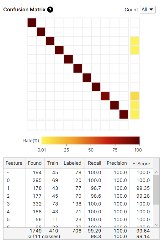 The Confusion Matrix is a visual representation of the ground truth versus the tool's predictions. The confusion matrix of the tool is a graphical representation of the Recall and Precision scores. Each row of the confusion matrix stands for the number of features that are labeled by user, which are the ground truths, and each column of the confusion matrix stands for the number of features that are predicted by the tool, which are the markings. If you click each cell at the Confusion Matrix on Database Overview, the corresponding item (views) in each cell of the table will be displayed on the View Browser.