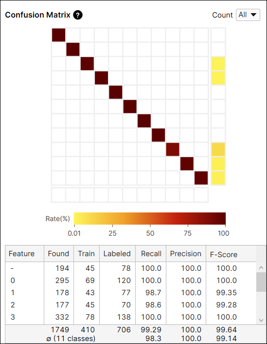 For another example, the color of the cell at the index (2,3) is yellow because among the features whose label is 'shaft' the number of features predicted as 'tip' is 2. The number of features predicted as 'tip' accounts for 1.4% (2/140) of the features whose label is 'shaft.'