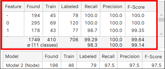 In the Database Overview of Blue Read, there are 2 tables and each shows different results. The one above displays the result metrics for each feature in the images, and the other one below displays the result metrics for each model in the images. Here, the model stands for one of the Node, String, and Regex Model, not a neural network model of the Blue Read.