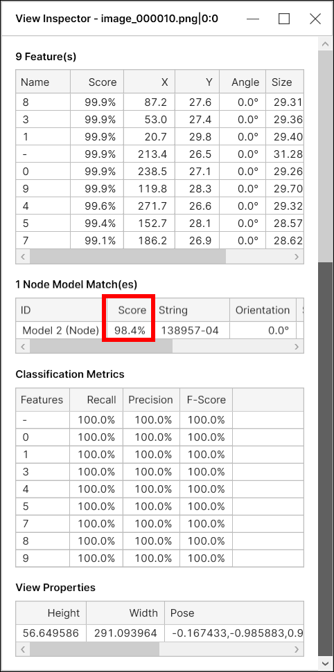 A found model is said to be a correct match (correctly marked model) if there is a labeled model in approximately the same position and if this found model has features that are close to the corresponding labeled features. The precision, recall, and F-score of model are calculated on this ground, and if there are multiple models in a view all model metrics are calculated by each model separately.
