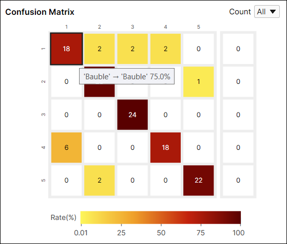 For example, the color of the cell at the index (1,1) is dark red because among the views whose label is 'Bauble' the number of views classified as 'Bauble' is 18 and it accounts for 75% (18/24) of the views whose label is 'Bauble.'