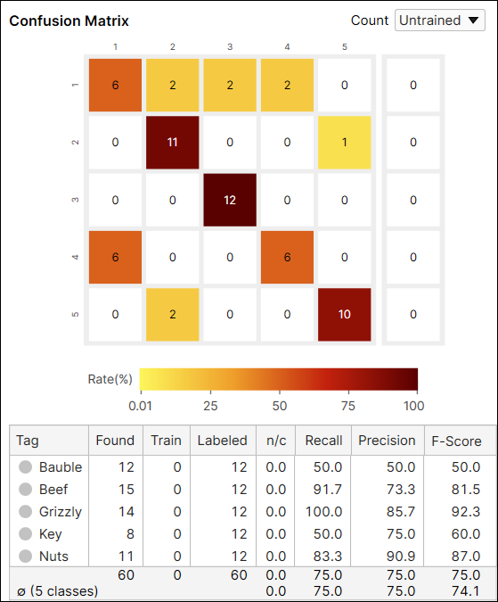 - Recall - The percentage of labeled classes that are correctly identified by the tool.