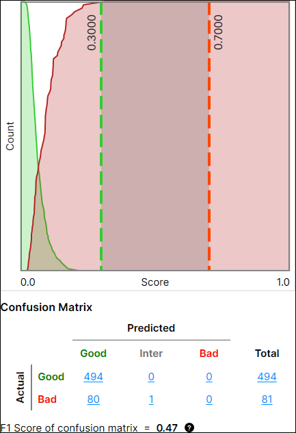 F1 Score of confusion matrix changes per the Count dropdown option. It is interpreted as the harmonic mean between the precision and recall of the current confusion matrix. If a view or a region is predicted as "Inter," it is counted as "Bad" for the calculation of precision, recall, and F1 Score.
