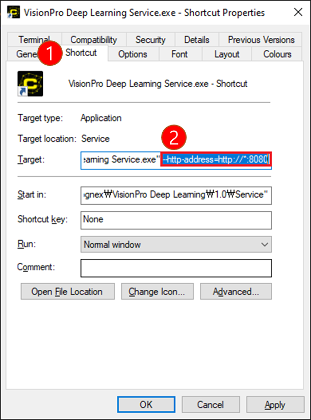 The Target field should be the following: "C:\Program Files\Cognex\VisionPro Deep Learning\3.2\Service\VisionPro Deep Learning Service.exe": --http-address=http://*:8080