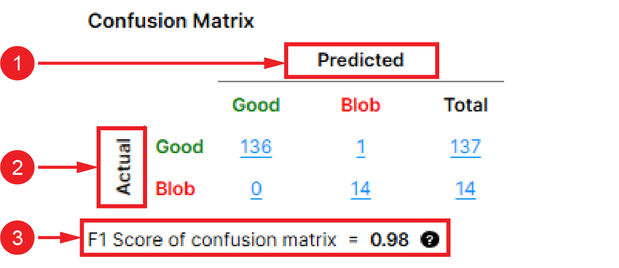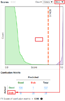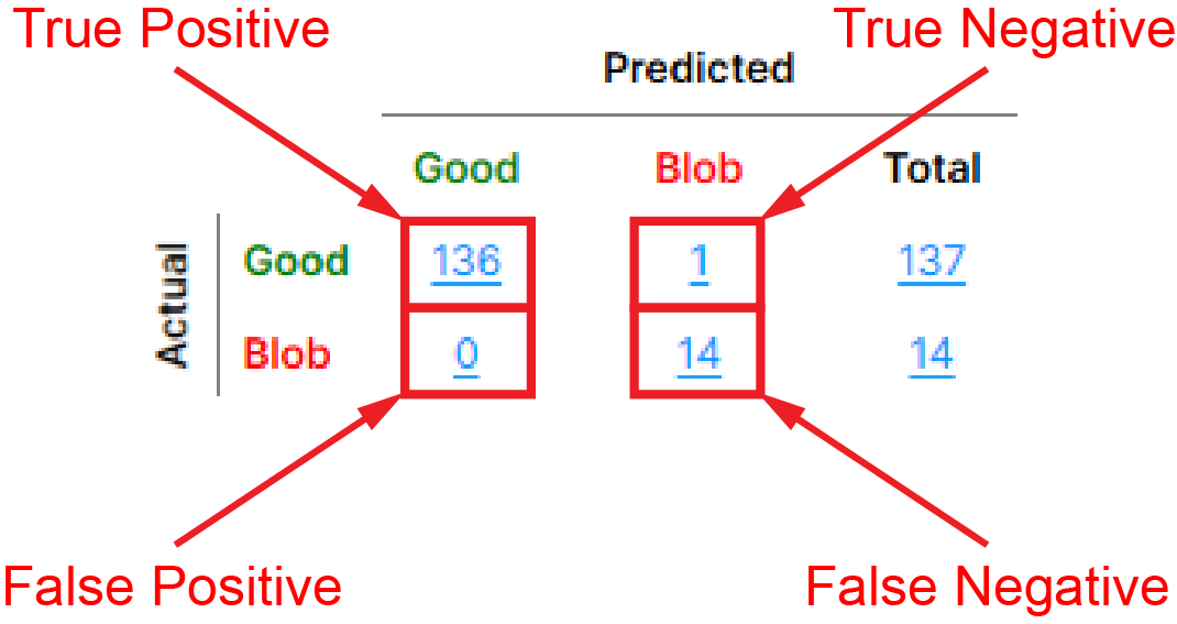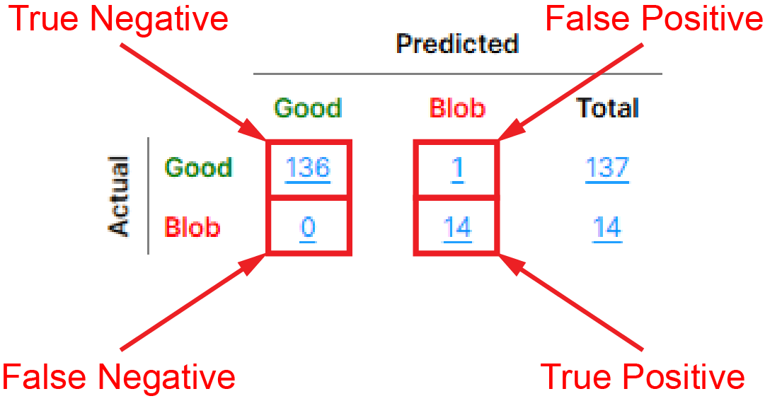 混淆矩阵仅将所选缺陷类计为“不良”,并将所有其他缺陷类计为“良好”.例如,对于缺陷类“Blob”来说,“良好”指的是所有“不是 Blob”的东西。这意味着“良好”和其他类的缺陷都计为“良好”。