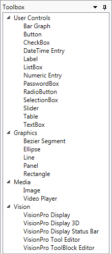 The Page Toolbox contains the interactive elements that will be used to construct an HMI UI. Drag and drop elements from the User Controls, Graphics, Media and Vision categories to construct a customized, interactive HMI UI.