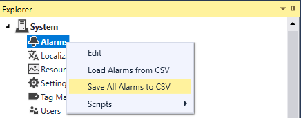 Cognex Designer supports importing and exporting the alarm list to a CSV file. This alarm list can be edited quickly in a program like Microsoft Excel and then imported back into Cognex Designer. This can be used as a way to very quickly generate and modify existing application alarms.