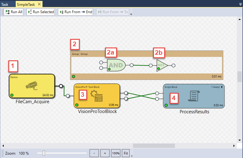 • You must use the Run All option before using the Run Selected, Run From → End, or Run From → To options if you have used any other component of the In-Sight Multi-Camera IDE prior to using the Task. This will ensure that any Task Block Input and Output pins, as well as tag values, are updated correctly.