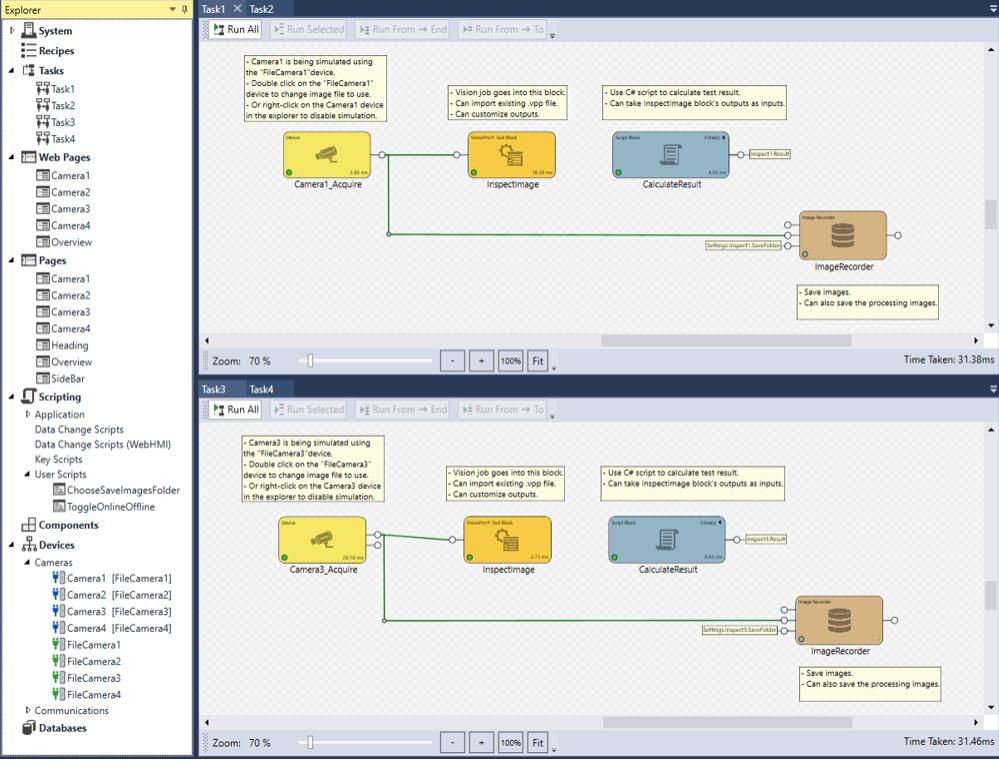 - Multi Camera - Select the Multi Camera option to set up a project for multiple camera, single task applications. In addition to the preconfigured blocks in the Single Camera example, an additional script block is included that calculates totals from all four acquisition processes.