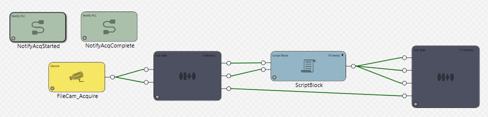 The Sub Task block allows you to organize and simplify a complex Task by placing other blocks inside it. Unlike the Group Region, the Sub Task block nests other blocks within itself, with its own Input and Output pins, and its own separate tab in which the blocks within it can be configured and edited. Sub Task blocks can also be exported as Templates.