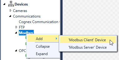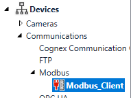 - The Modbus Client device does not support Devices simulation, nor the Cognex Designer Internal Object API.