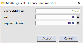Note that if the Server Address or Port property is modified in the dialog, then the Modbus Client disconnects from the Modbus Server it is connected to, and tries to re-connect with the updated properties.