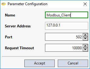 Parameter Type Description Name String The name used to list the Modbus Client device in the Project Explorer. Server Address String The host name or IP address (in standard IPv4 format) of the Modbus Server device you want to poll or write with the currently configured client device. The default value is 127.0.0.1 (localhost). Port Integer The port on which the Modbus Server device listens. The default value is 502 (which is the standard Modbus communication port) Request Timeout Integer The timeout in milliseconds for server requests. If no response is received for a request within the specified time interval, the configured Modbus Client hangs up the request and warns the user. The default value is 10000 ms. -