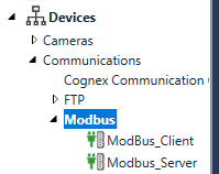 Modbus communication systems use Client and Server devices. (also called masters and slaves in other terminology). These clients and servers are represented as Devices in Cognex Designer.