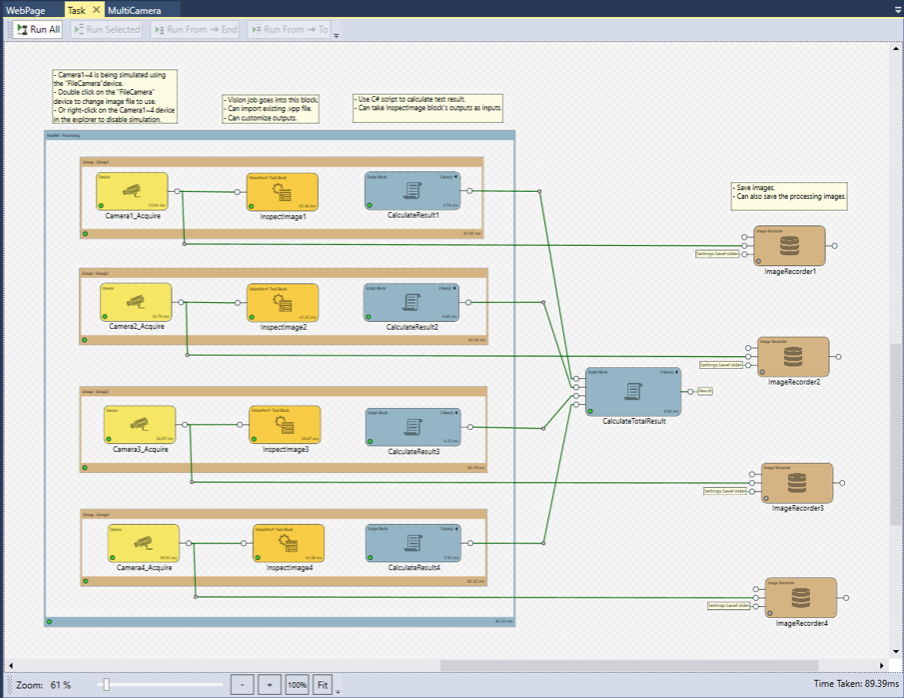 - Multi Camera - Select the Multi Camera option to set up a project for multiple camera, single task applications. In addition to the preconfigured blocks in the Single Camera example, an additional script block is included that calculates totals from all four acquisition processes.
