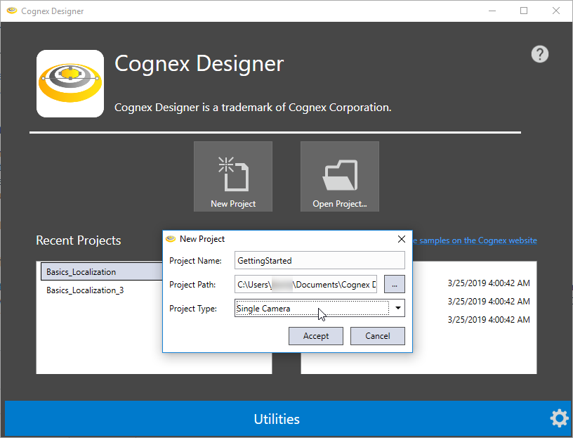 - Project Path: Specify the location where the project files will be stored. In this example, do not modify this setting, so that the project will be saved to the default location, which is the Projects folder of Cognex Designer: