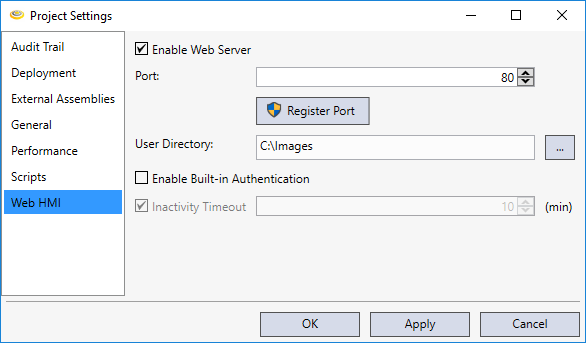 While the project is in deployed mode, the Inactivity Timeout determines the interval for user interaction with the PC running the WebPage HMI. When this setting is enabled (it is enabled by default), the current user will be logged off and all WebPage Elements that require authorization will become disabled if there has not been any interaction during the specified time period.