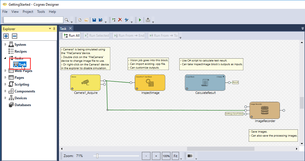 Once all settings are configured, click Accept. The Cognex Designer splash screen appears again and the GUI opens to a predefined Task window containing a single-camera task workflow. If the Task window does not open automatically, double-click Task in the Explorer pane to open the Task tab as seen below.