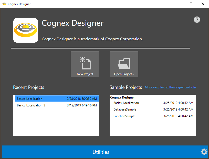 - Launch Cognex Designer. The Cognex Designer splash screen appears, followed by the Launch Page, as seen below.