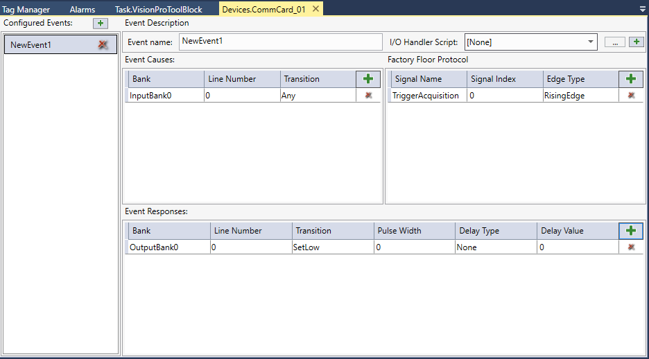 This editor is used to setup the event causes and responses, as well as the I/O host notification script. The editor's input, output and line numbers are populated by the specified communication card, therefore the connected or disconnected card will change the behavior of the editor. If a card is disconnected, all of the available input and output banks for that card model will be present, even if, when connected, they would not be available.