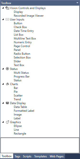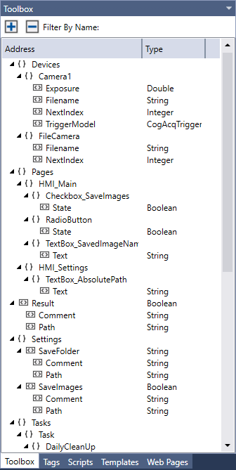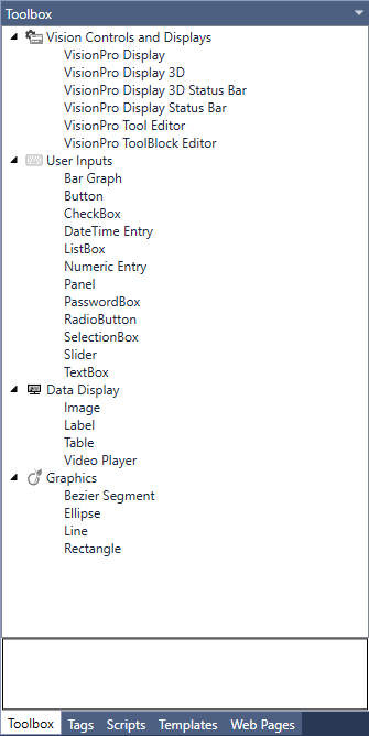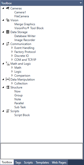 The Toolbox is a context-sensitive window that lists the project resources usable in the various editors of Cognex Designer. The contents of the Toolbox are populated based on which editor is currently selected in the user interface. When working in an editor, you can simply drag-and-drop items from the Toolbox into it to develop your project:
