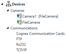 Devices: Contains the devices currently available to the system; the icon beside the device indicates the current state of the device. Devices are sorted in two major categories: Cameras, used for image acquisition, and Communications devices, used for setting up communications means in the project.
