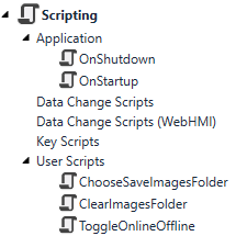 Scripting: Contains all the configured Application Scripts, Data Change Scripts, Key Scripts, and User Scripts configured in the project. New scripts can be added, and existing scripts can be organized into folders, if necessary.