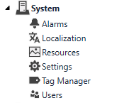 System: Contains the configuration options for Alarms, Project Localization, Resources, Project Settings, Tag Manager and User Access.
