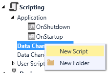 This will create a new item under the Data Change Scripts node, and opens a new Script Editor where you can write the code to execute on data change.