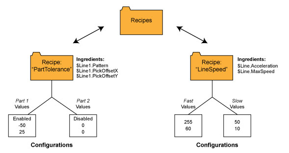 In a Cognex Designer application, this would mean you had a Recipe called "ChocolateCake", with Tags for $Eggs, $Flour, $Sugar, $Butter, and three Configurations of Small, Medium and Large.