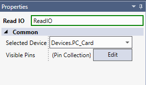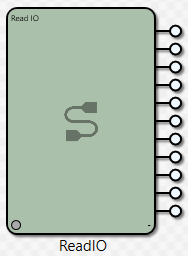 The Read IO Block reads the lines of Input Bank 0, and the state of the Precision I/O interface, from the Cognex Communication Card, and assigns them to the block's output pins. The number of output pins are defined by selecting the number of visible output pins that can be configured, using the Select Visible Pins dialog.