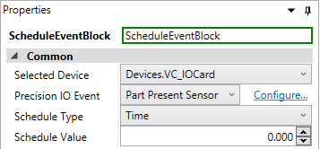 The Schedule Event Block is used in conjunction with the Precision IO Configuration Editor, to schedule a precision I/O event to occur. The block's input pin is a CogPrioState type, called Relative Source, which can be used to schedule an event relative to a specific state (e.g. if the Schedule Type parameter is set to Time, the Schedule Value parameter is set to 200 milliseconds, and the relative source is set to 1000 milliseconds as the current time value, the event will be scheduled to occur at 1200 milliseconds). A CogPrioState object can be created with a Read IO; if a relative source is not provided, the event will be scheduled relative to the state when the block is executed.