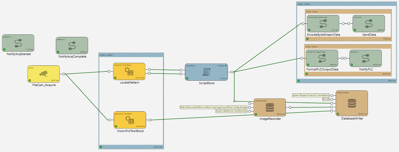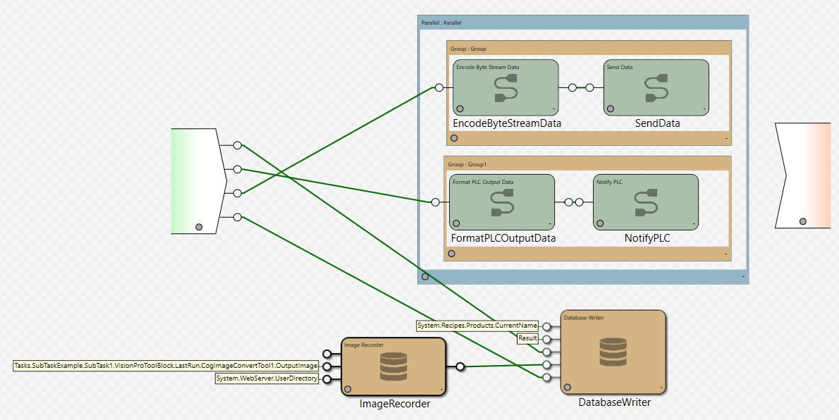The Sub Task block allows you to organize and simplify a complex Task by placing other blocks inside it. Unlike the Group Region, the Sub Task block nests other blocks within itself, with its own Input and Output pins, and its own separate tab in which the blocks within it can be configured and edited. Sub Task blocks can also be exported as Templates.
