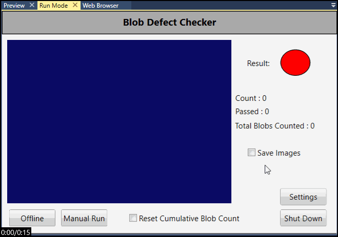 3. Run the application as often as you like by clicking the Manual Run button on the page. Notice that the application works as intended, counting all the blobs, and resetting the blob count when the Reset Cumulative Blob Count checkbox is unticked and then ticked again, as shown below (right-click on the GIF and open it in a new browser tab or window to play the animation from the beginning).