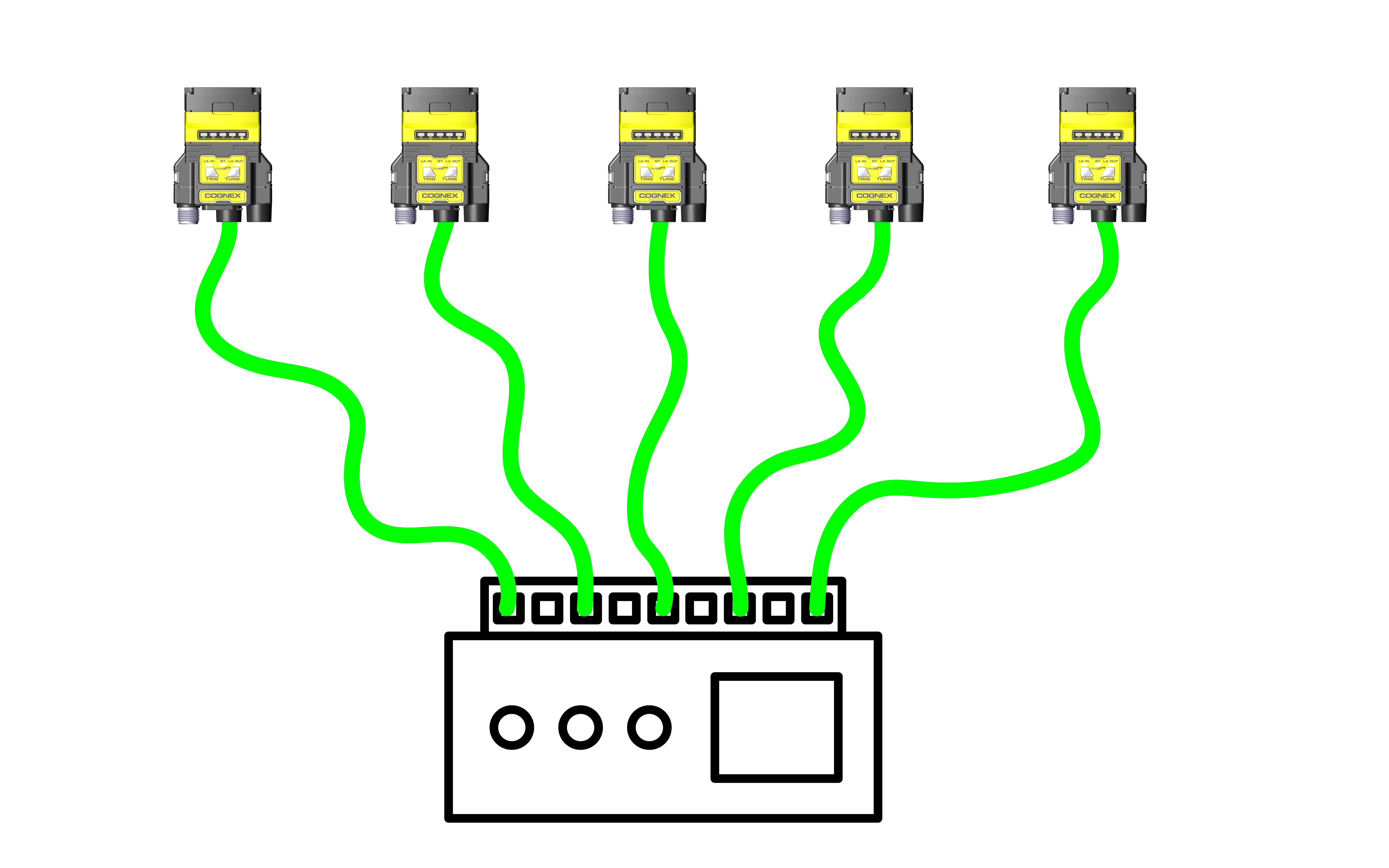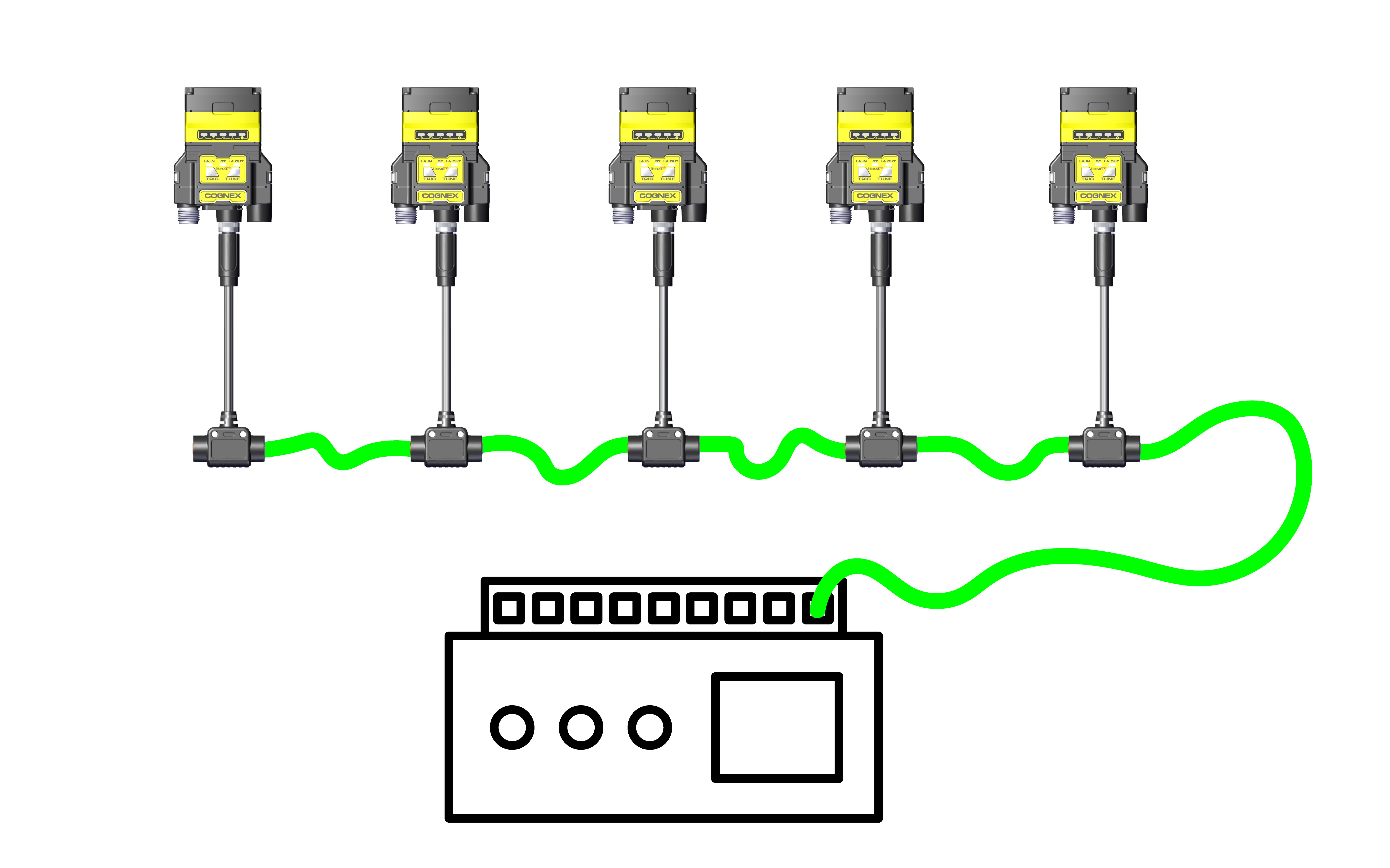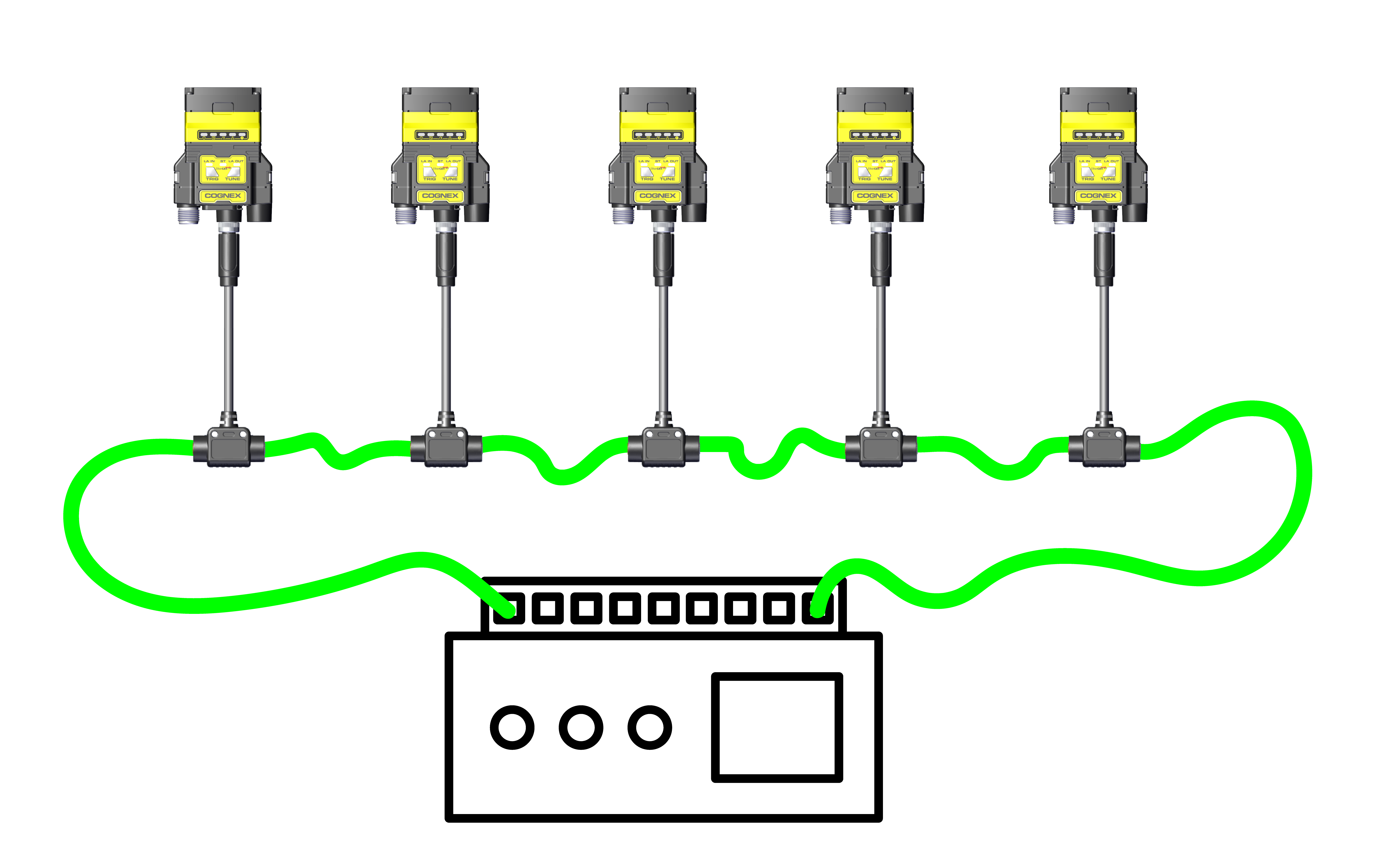 The line topology connects the readers in daisy chain. The output of one adapter cable is plugged into the input of the next one. The line starts at the output from the PLC, and ends at the input connector of the last reader. This topology reduces the cabling needed to connect all readers.
