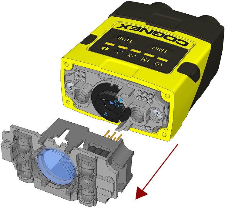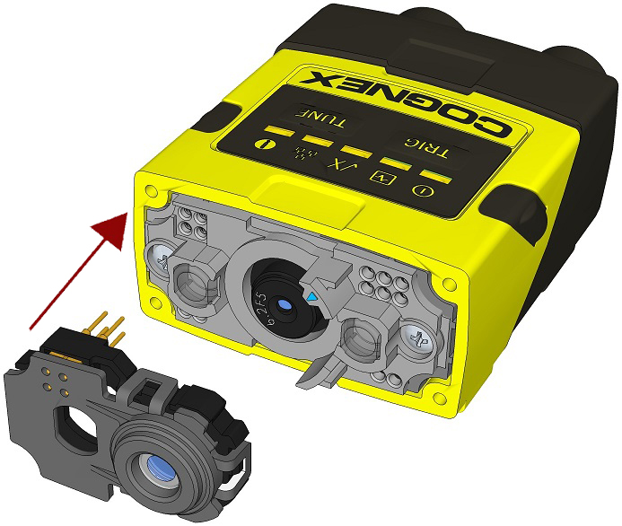 5. Attach the liquid lens accessory by aligning the 2x2 connectors of the liquid lens with the 2x2 sockets on the optics mount.