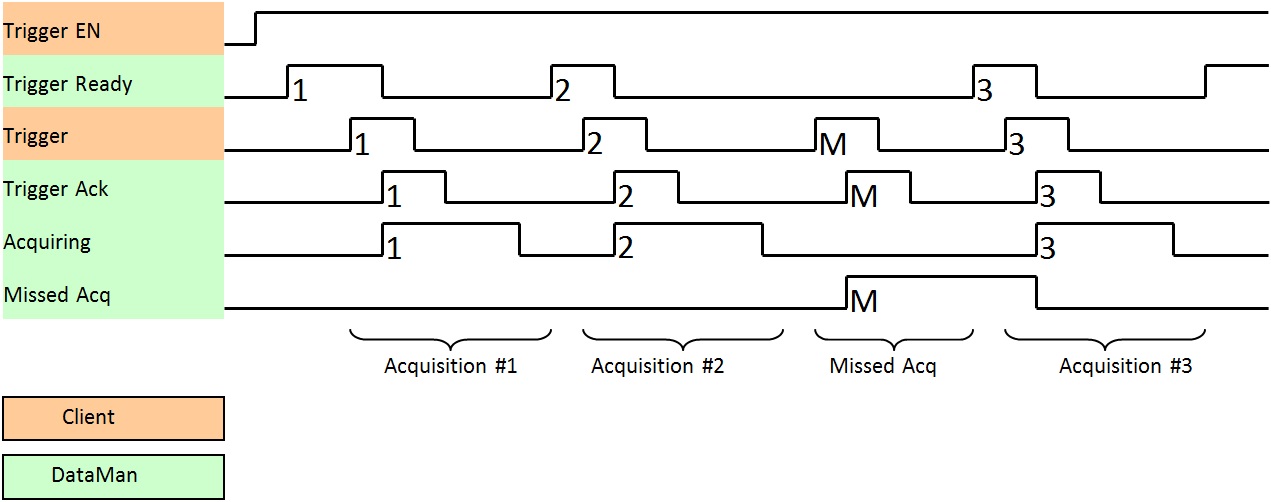 While the AcqStatusRegister “Trigger Ready” bit is True, each time the ID Reader object sees the AcqTrigger attribute change from 0 to 1, it initiates an image acquisition. When setting the Trigger Ready bit to True through the assembly objects, make sure that the attribute is held in the new state until that same state value is seen in the Trigger Ack bit of the AcqStatusRegister. This is a necessary handshake to guarantee that the change is seen by the ID Reader object.
