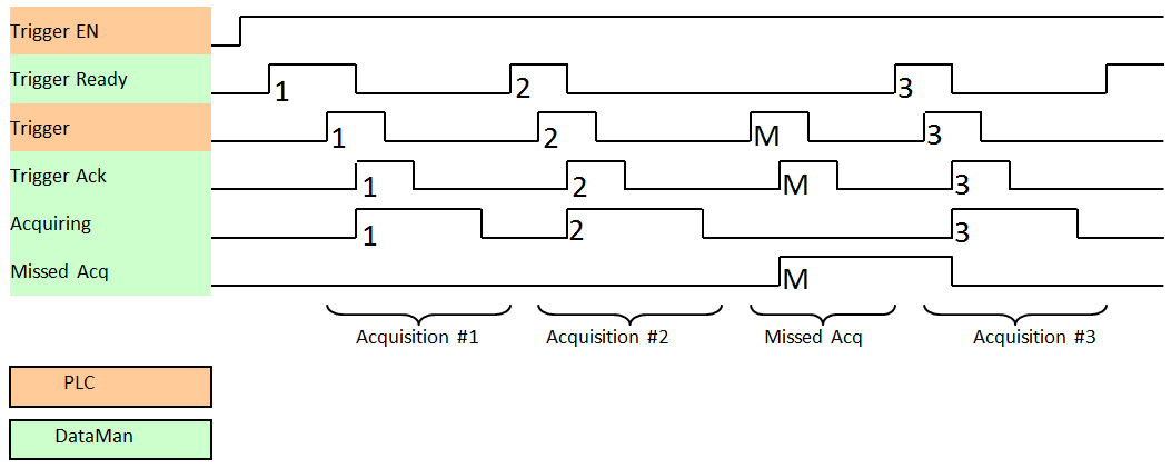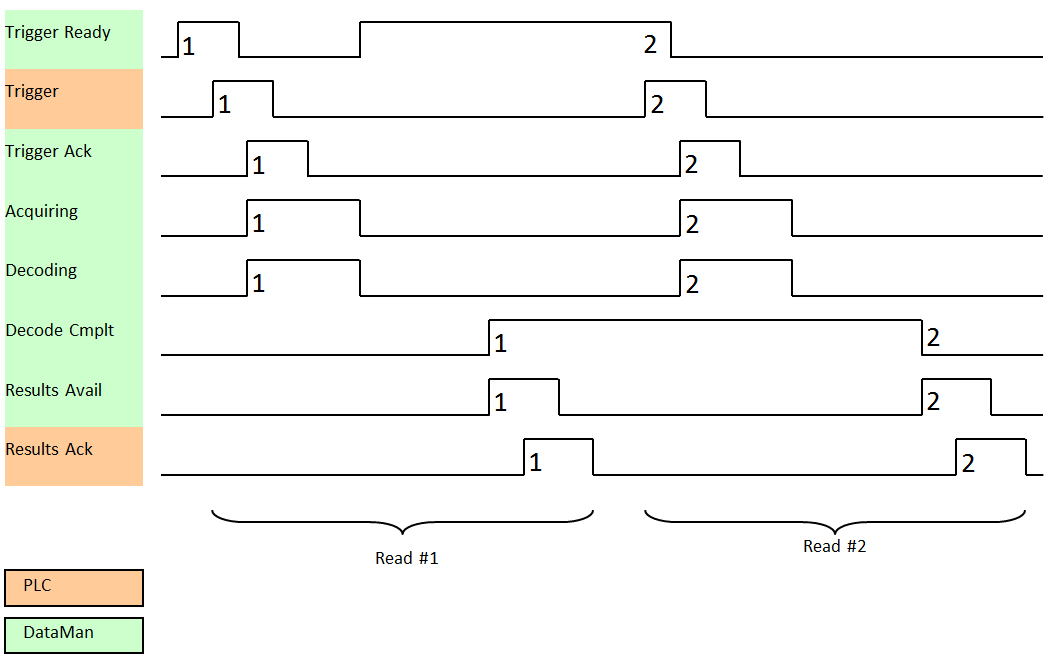 As a special case, an acquisition can be cancelled by clearing the Trigger signal before the read operation has completed. This allows for the cancellation of reads in Presentation and Manual mode if no code is in the field of view. To ensure that a read is not unintentionally cancelled, it is advised that the PLC hold the Trigger signal True until both TriggerAck and ResultsAvailable are True (or DecodeComplete toggles state).