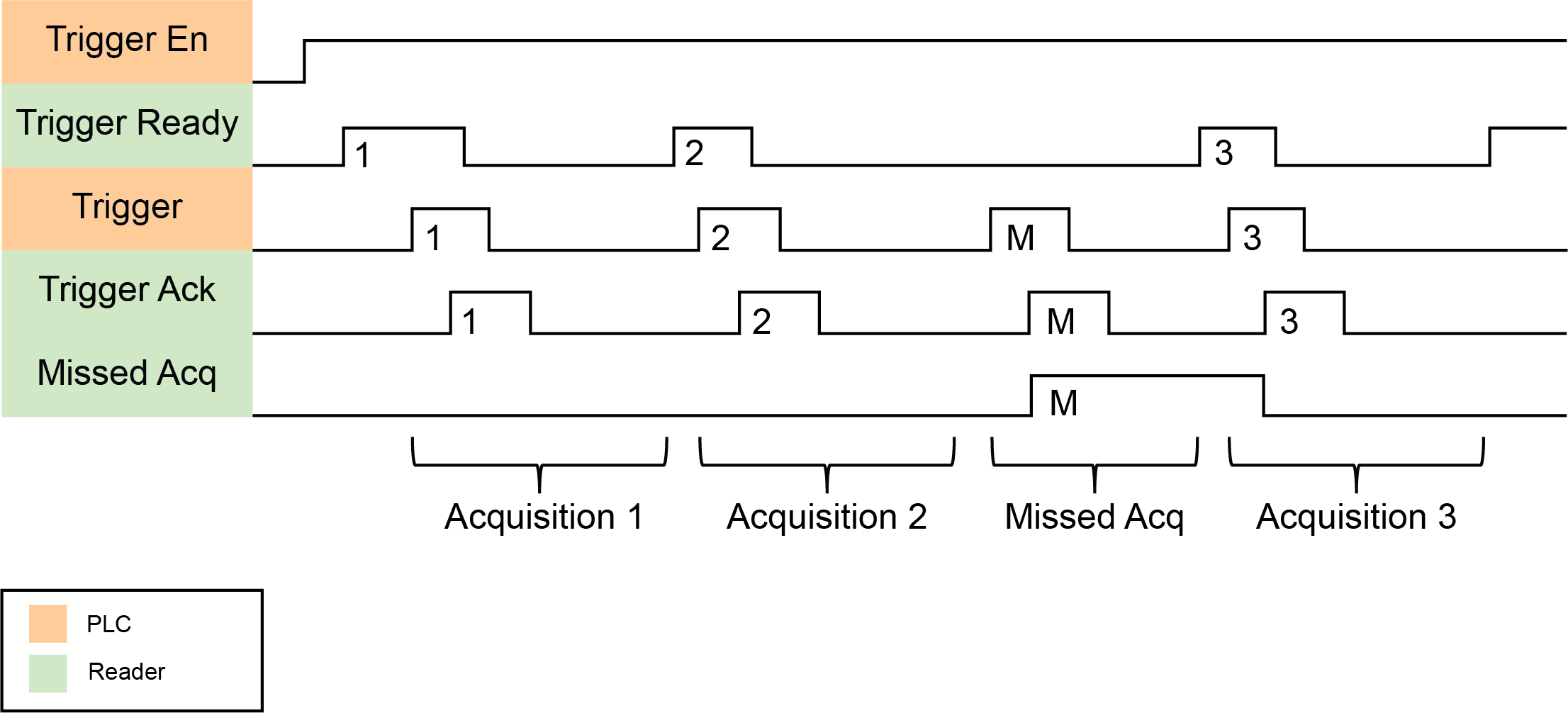 As a special case, you can cancel an acquisition by clearing the Trigger signal before the read operation is complete. This allows for canceling reads in Continuous and Manual mode if no code is in the field of view. To ensure that a read is not unintentionally canceled, make sure that the PLC holds the Trigger signal True until both the TriggerAck and ResultsAvailable bits are True (or the DecodeComplete bit toggles state).