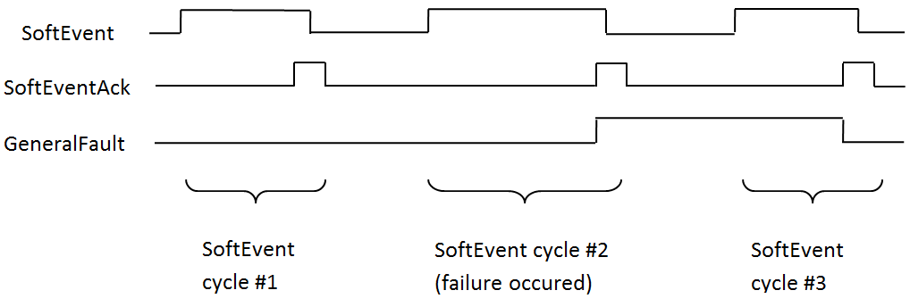 When a communication-related fault occurs, the GeneralFault bit will change from 0 to 1. Currently the only fault conditions supported are SoftEvent operations. If a SoftEvent operation fails, the fault bit will be set. The fault bit will remain set until the next successful SoftEvent operation, or, until TriggerEnable is set to 0 and then back to 1.