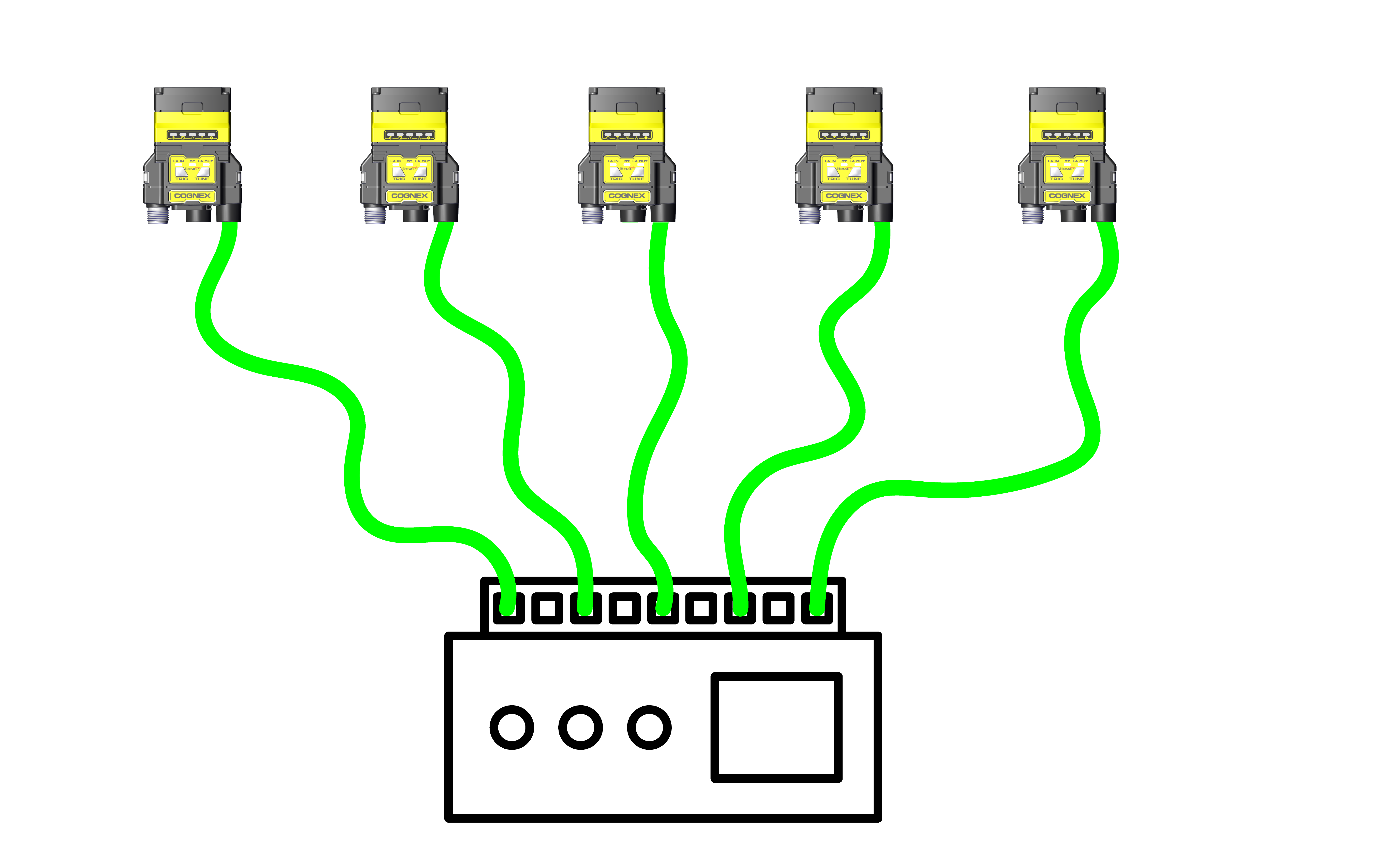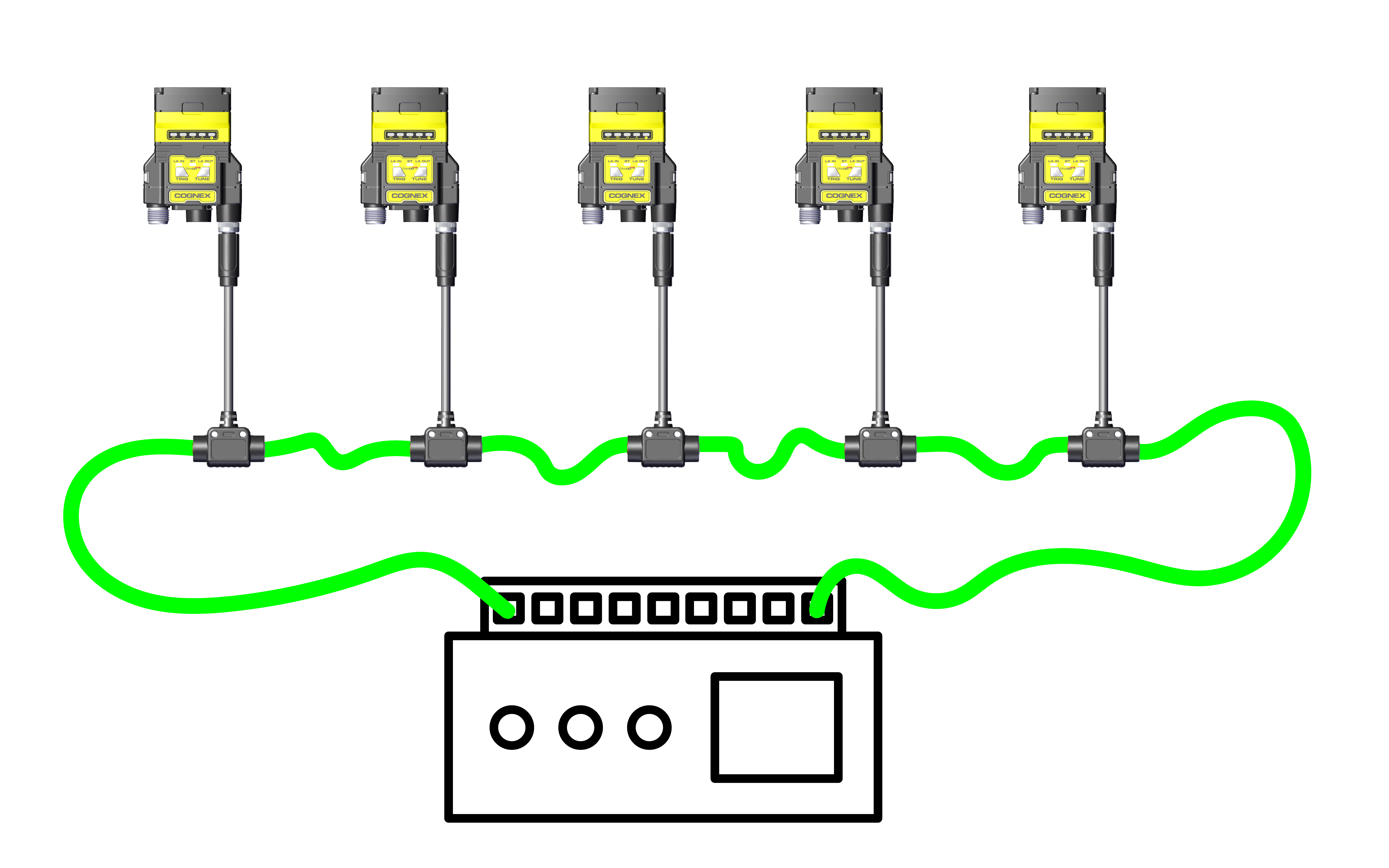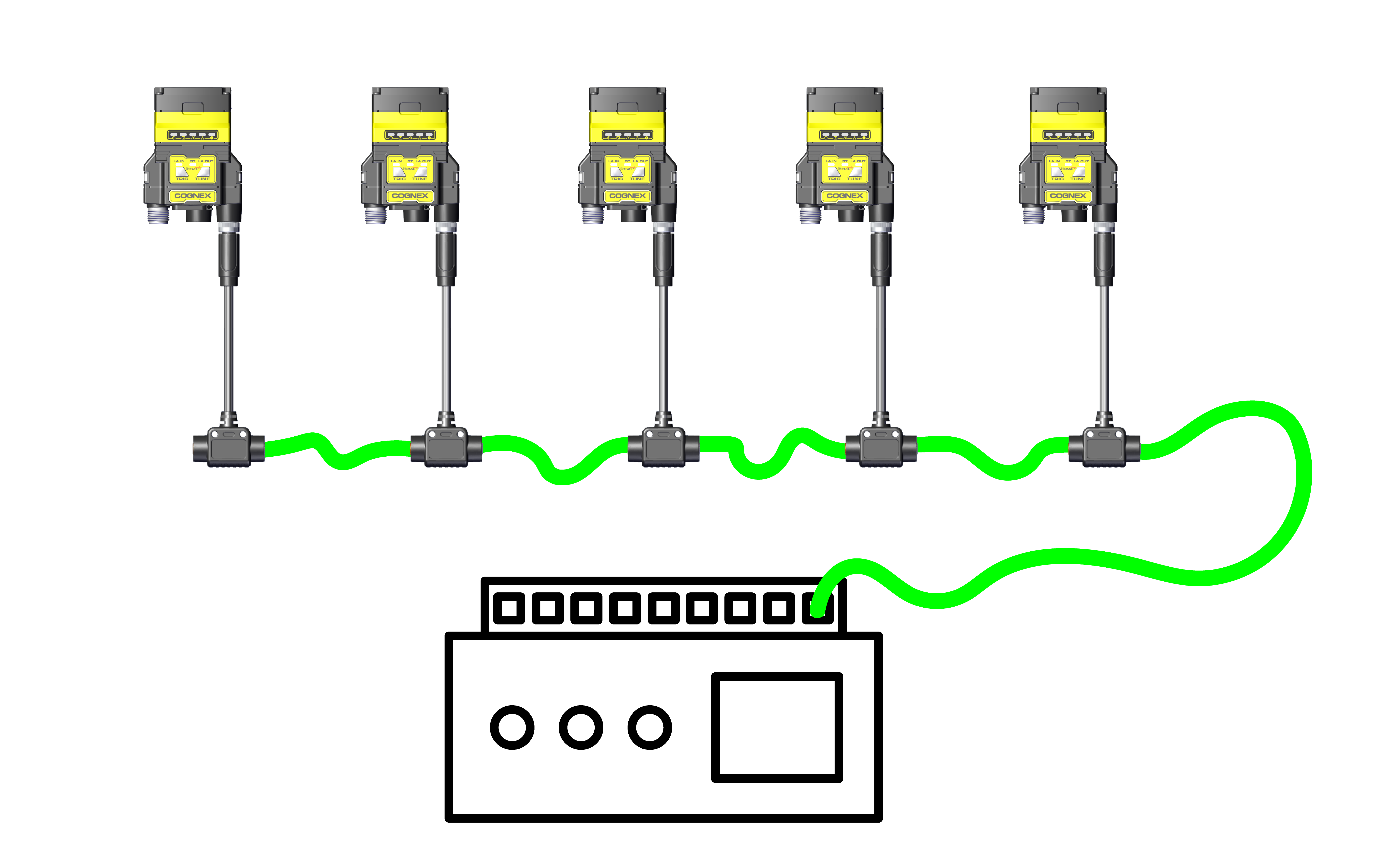 The line topology connects the readers in daisy chain. The output of one adapter cable is plugged into the input of the next one. The line starts at the output from the PLC, and ends at the input connector of the last reader. This topology reduces the cabling needed to connect all readers.