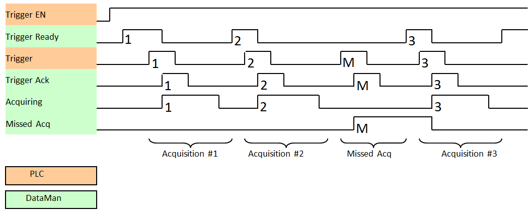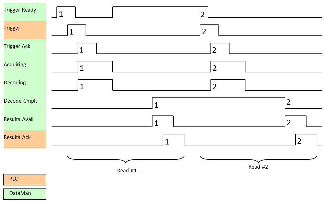 As a special case, an acquisition can be cancelled by clearing the Trigger signal before the read operation is complete. This allows for canceling reads in Presentation and Manual mode if no code is in the field of view. To ensure that a read is not unintentionally cancelled, make sure that the PLC holds the Trigger signal True until both TriggerAck and ResultsAvailable are True (or DecodeComplete toggles state).