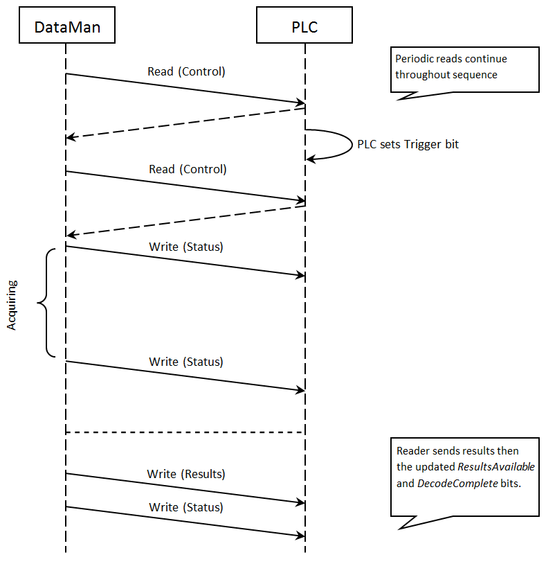 A number of actions are accomplished by means of a logical handshake between the reader and the PLC: triggering, transferring results, executing SoftEvents, string commands, and so on. This ensures that both sides of a transaction know the state of the operation on the opposite side. Network transmission delays always introduce a finite time delay in transfer data and signals. Without this handshaking, one side of a transaction might not detect a signal state change on the other side. Any operation that has both an initiating signal and corresponding acknowledge signal uses this basic handshake procedure.