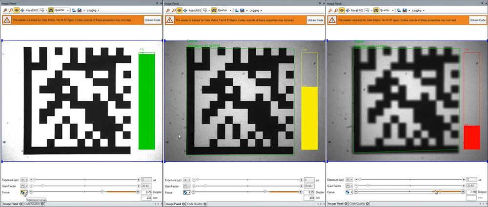 Focus is indicated by colors ranging from red (bad focus) to green (sharp focus). When focusing the reader, you need to adjust its position until the focus column becomes green.