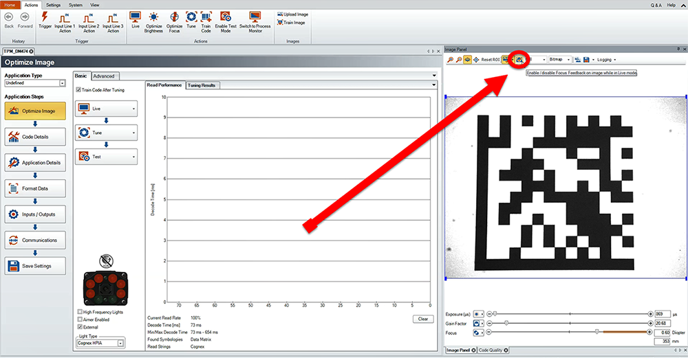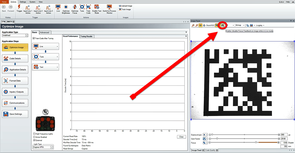 - Click the Focus Feedback button in the image panel in SetupTool to enable focus feedback.