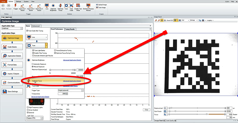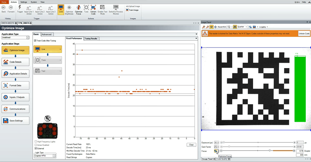 DataMan readers are compatible with multiple different lenses. Each lens has a range of reading distances available for different code sizes and focus positions. Having accurate focus settings is essential to maximize read rates.