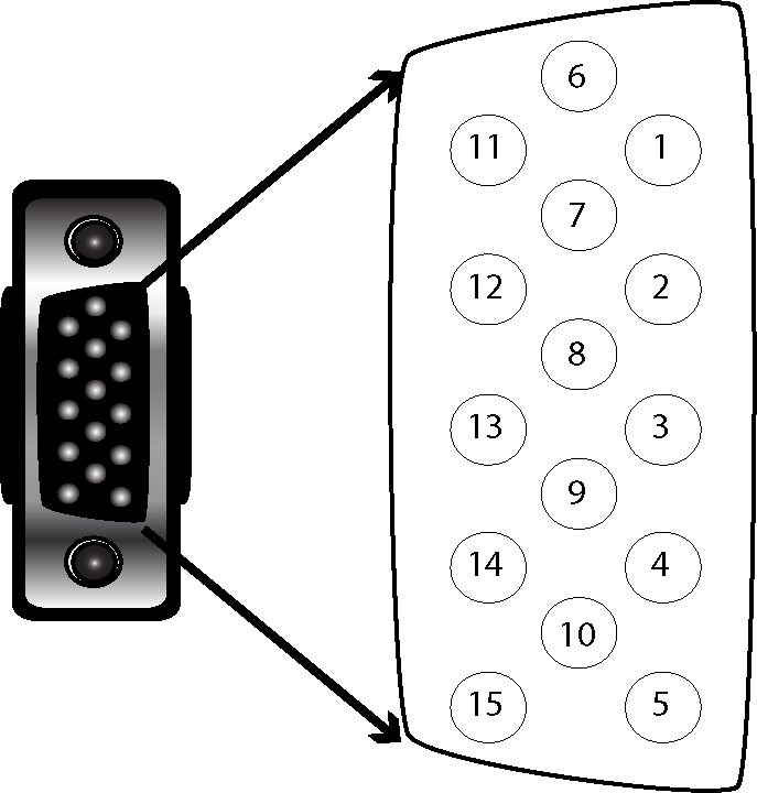 The I/O module with USB has all signals on a SUB-D 15 connector with the following pinouts: