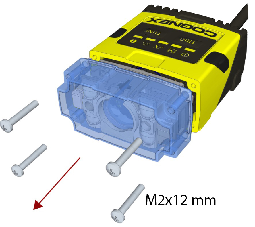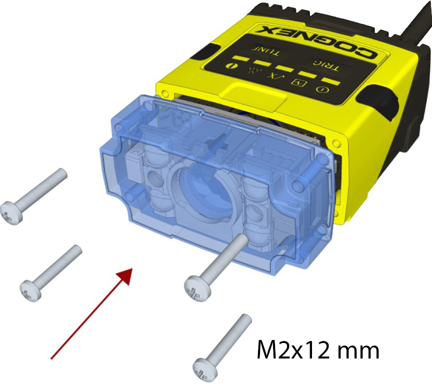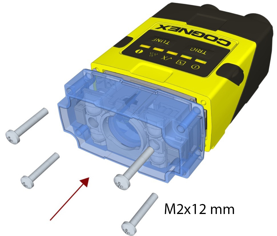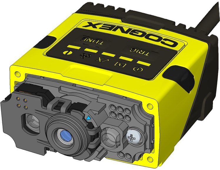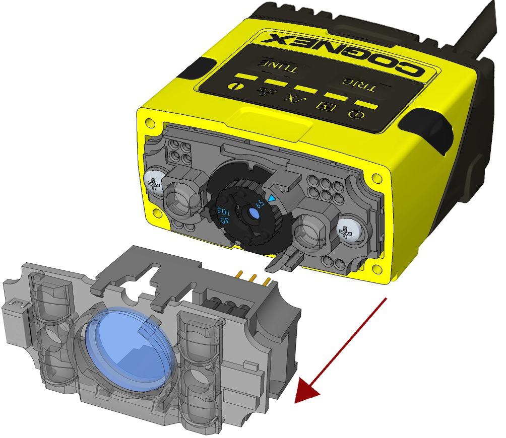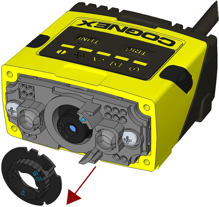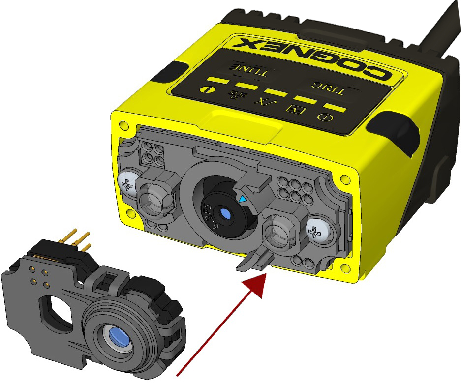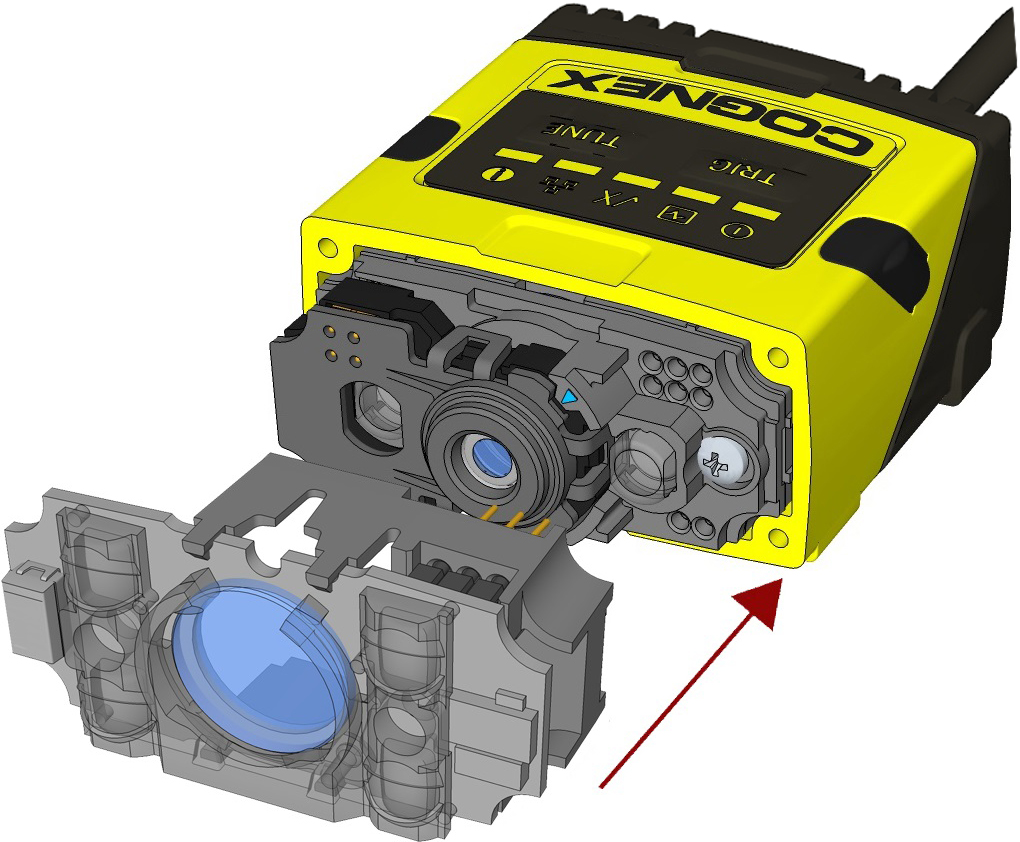 Note: The rib in the front cover must be oriented to the top side.Note: The DataMan 150 and the DataMan 260 liquid lens must be calibrated after field exchange. This can be done under Focus Settings in the DataMan Setup Tool. For more information, see the DataMan Questions and Answers document. A reboot is required for the lens to operate with the new settings.