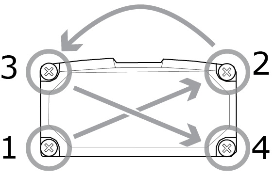 Attach the front cover. Observing the tightening sequence below, tighten all four M2x12 mm Phillips Pan screws to 9 Ncm using a torque wrench.