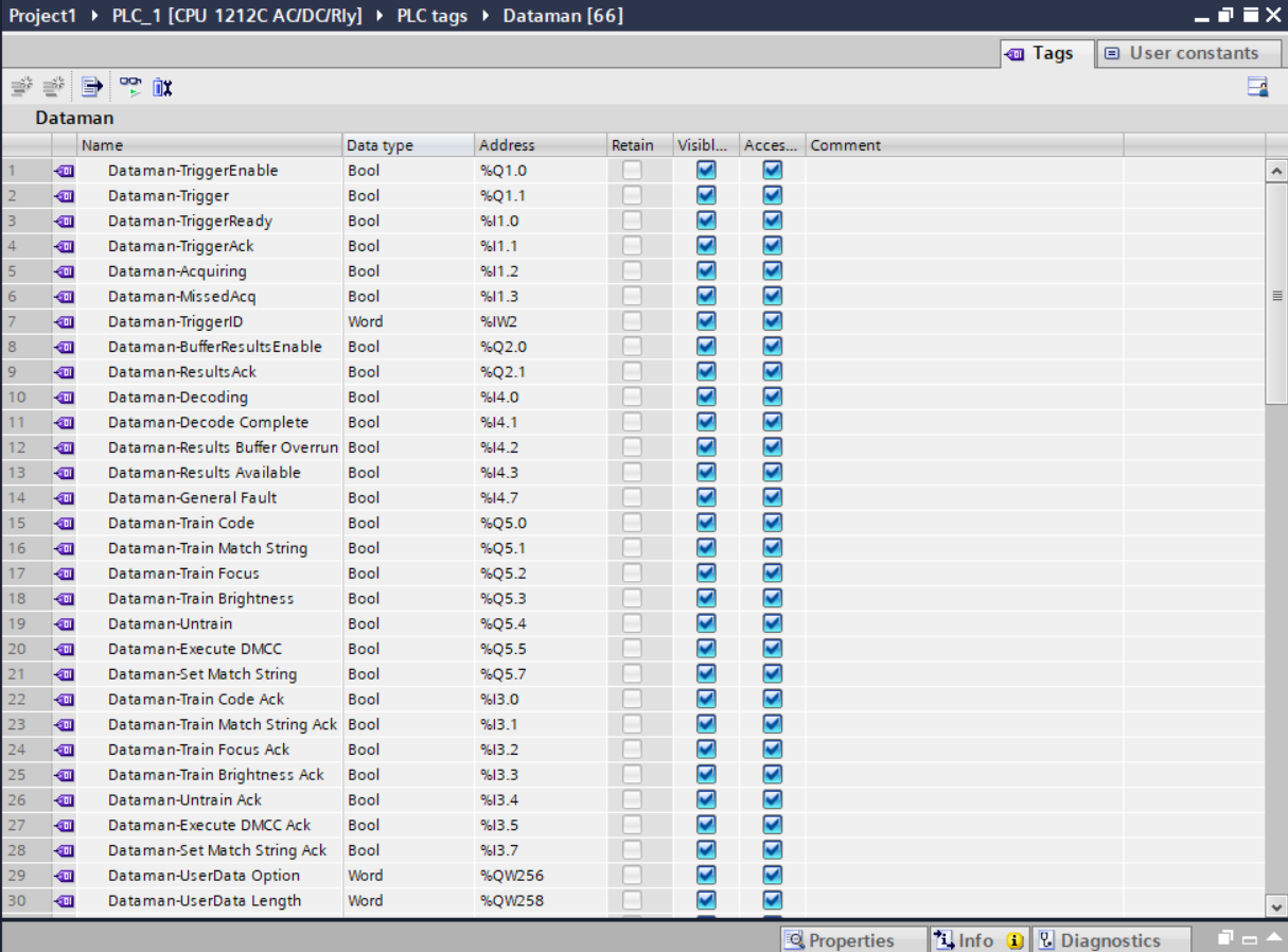 It is recommended that you define symbols for the DataMan I/O module elements to make the code much easier to read and reduce mistakes. This sample table shows symbols defined for a typical instance of a DataMan reader. It is possible that DataMan I/O modules are at different addresses in your project. Make sure to adjust your symbol definitions based on the specific offsets of the I/O modules. For more information, see the TIA Portal Integration Guide for In-Sight and DataMan at https://support.cognex.com/en/downloads/detail/in-sight/3687/1033.